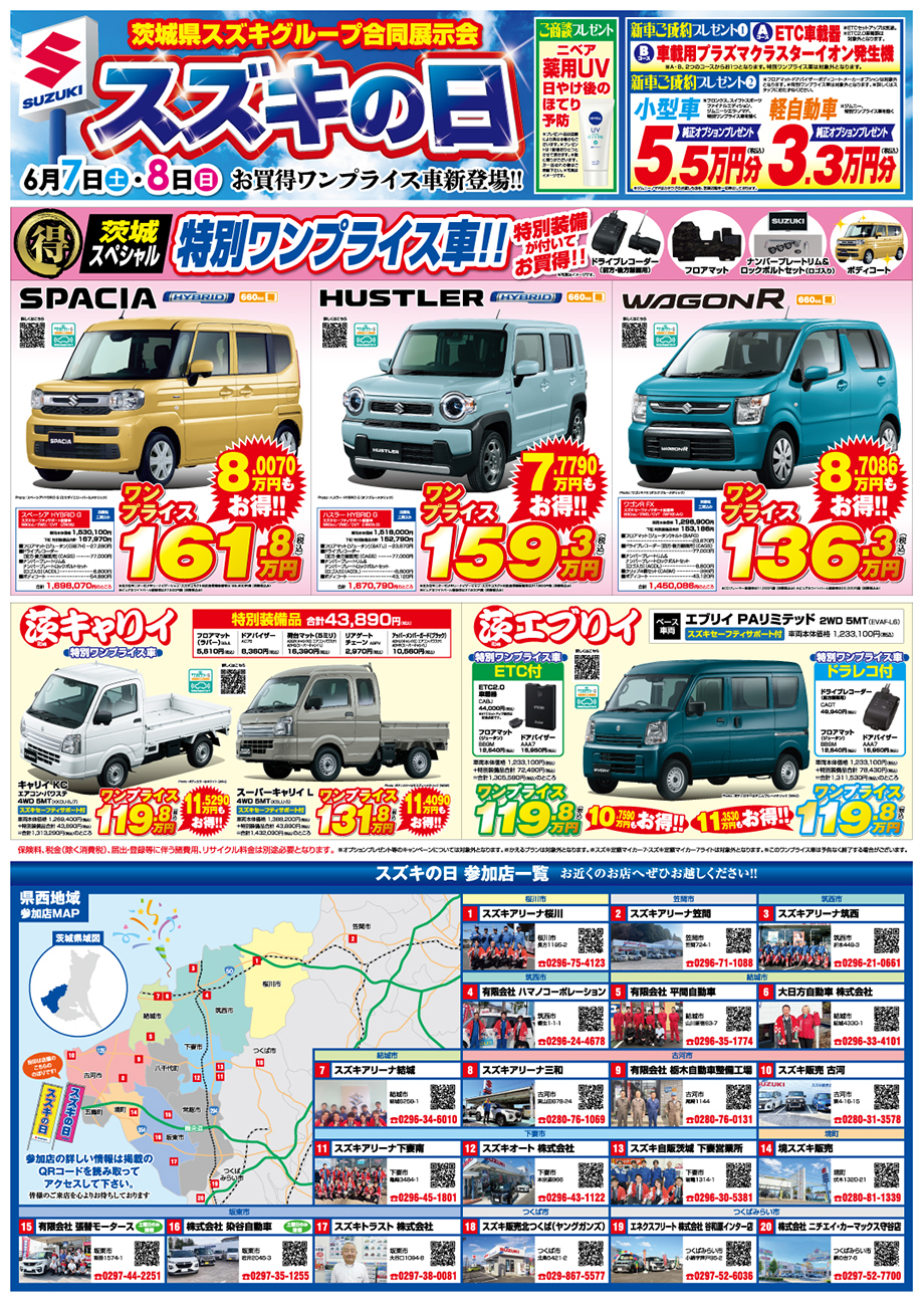 特別装備がついてお買得な「茨城スペシャル特別ワンプライス車」をご用意!スペーシア、ハスラー、ワゴンRがお得に買えるチャンスです。